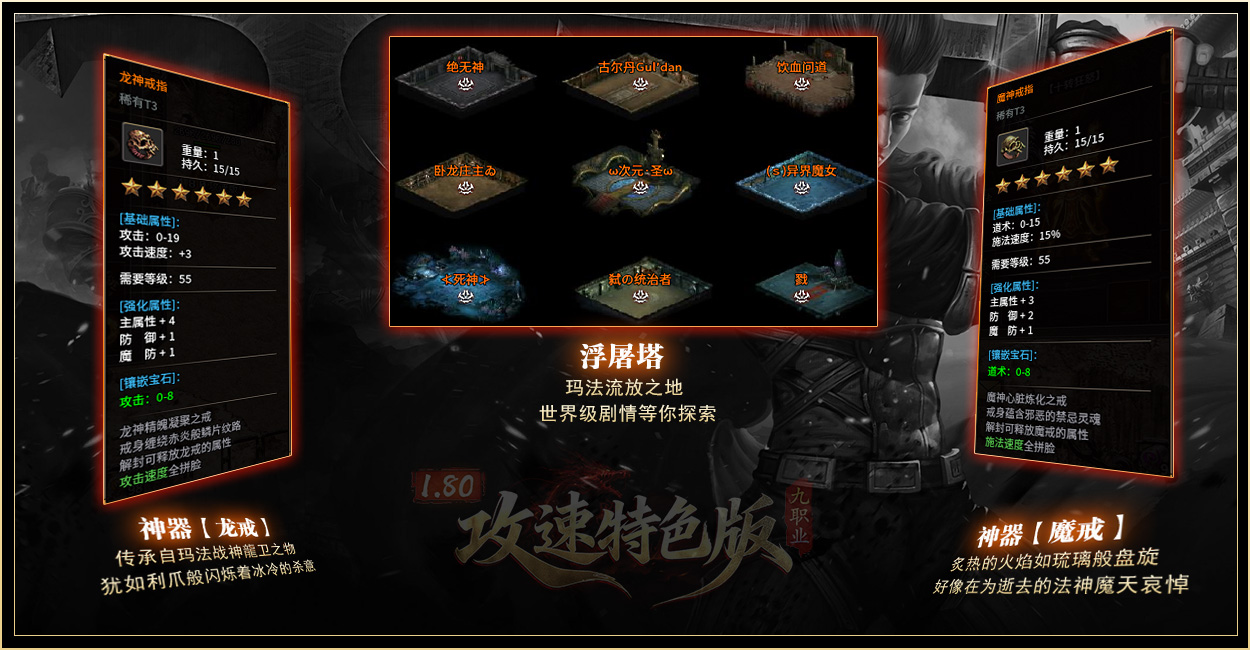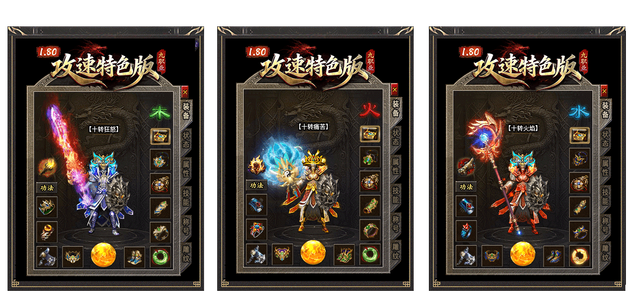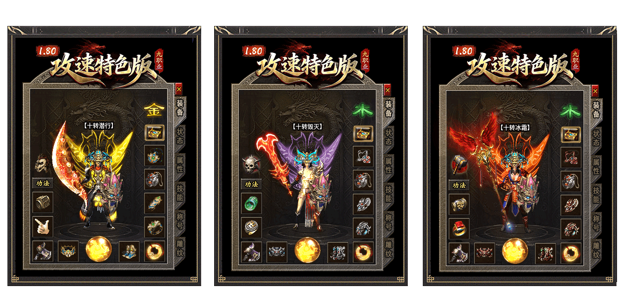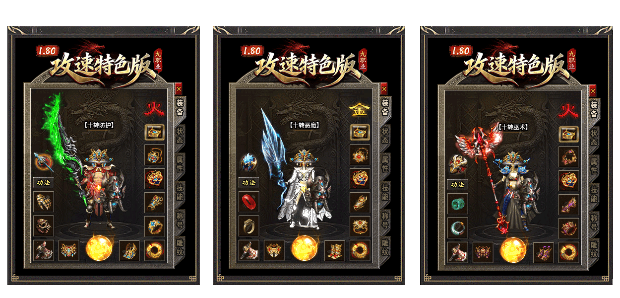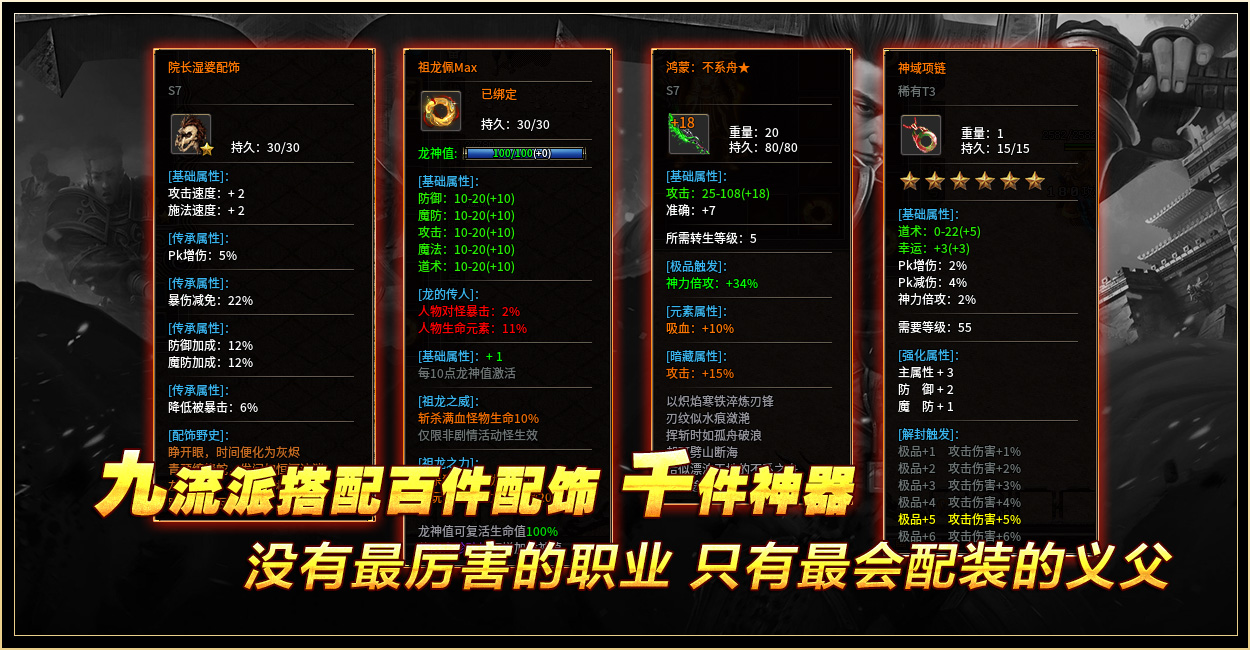 游戏内共有九种天赋,上千件装备自由组合,生肖,雕纹,功法,特殊神器!